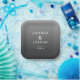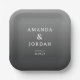 This elegant wedding plate features a minimalist design with a gradient gray background, creating a sophisticated and modern look. The clean, sans-serif typography highlights the names "Amanda & Jordan" in bold, while smaller text below indicates the location and date. The monochromatic color palette enhances its timeless appeal, making it perfect for formal occasions. Its understated style emphasizes clarity and simplicity, ideal for couples seeking a refined aesthetic for their special day.