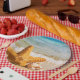 Platos de papel con una bonita fotografía de una estrella de mar colocada en la arena. Debajo del brazo hay una pequeña concha que descansa cómodamente. Está situado en una playa con olas que rompen en el fondo.