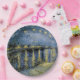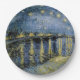 Casas de campo de paja en Cordeville. Vincent Willem van Gogh. Paisaje nocturno en tonos azul oscuro y amarillo. Hay un puente a través del río. En primer plano, un hombre y una mujer caminan por el terraplén. Las estrellas brillan en el cielo. Reproducción de obras famosas de imágenes artísticas de dominio público.