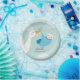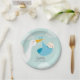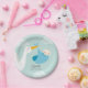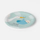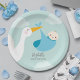 Una linda cigüeña blanca lleva a un bebé en un paquete azul a través del cielo, platos perfectos para una ducha de bebé. También disponible en paquetes de bebé de color rosa y amarillo. COINCIDIENDO con los artículos de nuestra tienda.