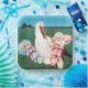 Elegante, divertido, vibrante diseño de colores azul verde azulado rosado para un bebé gemelo y una niña con una lujosa cigüeña en el campo verde, naturaleza bajo el cielo azul, re-elaborada de vintage.