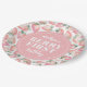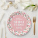 Un diseño de placa de papel de primer cumpleaños de Berry lindo y ondulado con un patrón de fresa rosa color agua con hojas verdes alrededor del borde. El centro de la placa tiene un suave círculo rosa con el nombre del niño BERRY primer cumpleaños en blanco, añadiendo un toque dulce y personalizado. Este diseño es perfecto para una celebración de cumpleaños Berry First, con un toque divertido y festivo en la mesa de su fiesta. Ideal para la primavera, el verano o cualquier temporada en la que se quiera celebrar su pequeño con un tema encantador y lúdico.