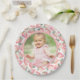 Un diseño de placa de papel de primer cumpleaños de Berry lindo y ondulado con un patrón de fresa rosa color agua con hojas verdes alrededor del borde. En el centro de la placa se ve una foto del chica de cumpleaños enmarcado por un delicado borde rosa, que le da un toque dulce y personal. Este diseño es perfecto para una celebración de cumpleaños Berry First, con un toque divertido y festivo en la mesa de su fiesta. Ideal para la primavera, el verano o cualquier temporada en la que se quiera celebrar su pequeño con un tema encantador y lúdico.