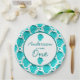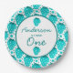 Cute strawberry illustrations, strawberry boy 1st birthday party paper plates. Features, blue illustrated strawberries pattern and pretty "one" script graphic.