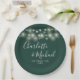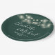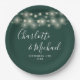 Elegantes platos de papel de boda verde esmeralda con luces de cuerdas de bonito, nombres de estilo y su fecha especial de boda. Diseñado por Thisisnotme©