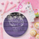 Estos elegantes platos de papel con luces de cuerda de bonito y un floral dibujado a mano se pueden personalizar con su información en letras blancas de moda sobre un fondo rústico de paneles de madera violeta. Diseñado por Thisisnotme©