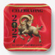 Elevate your 2027 lunar new year entertainment and dining experiences with these celebratory paper plates, which feature the Fire Goat dancing on a luxurious faux red silk background bordered by faux gold foil, plus the Chinese letterform for the Goat/Sheep/Ram in faux gold foil, standing in place of the zero in the year.