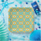Stylized geometric pattern with bold orange hexagons and white details against a teal background, forming a repeating, symmetrical design.