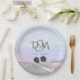 Un par de cascos de motocicleta se sientan contra un atardecer oscuro en este plato de papel de recepción de bodas de pareja de motociclistas. Se puede personalizar fácilmente para adaptarlo a sus propias necesidades.
