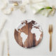 Platos de papel con diseño de tablones de madera oscura rústica con la silueta de un mapa mundial blanco. ¡Ideales para una boda rústica con tema de viaje o cualquier fiesta!