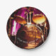 ¿Planificación de una celebración para un batería? - Las ilustraciones originales en estas placas de papel son una fotografía original de un sistema del tambor en etapa en un atasco al aire libre. Guitarras, tambores, bajo y armónica unidos para ciertos azules y música rock como el sol fijado sobre los jugadores. ¡El texto lee "el golpe se enciende! ", pero él se fija para que le personalice, o suprima si usted prefiere.
