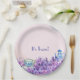 Un bonito plato de papel con fondo de rosca, flores moradas, té azul y una olla de té. Perfecto para celebrar a una futura madre gemela. El texto es personalizable. ¡A los clientes de la ducha de bebé les encantará comer estos platos de colores!