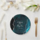 These elegant modern wedding paper plates feature a teal blue watercolor agate geode background trimmed with faux silver glitter. Personalize them with the names of the couple in silver gray handwriting calligraphy over a large ampersand, and the wedding date in copperplate font.