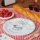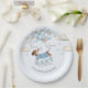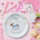 Adorable 'A Teenie Weenie Baby is on His Way' paper plates - personalized for the mom-to-be's baby shower. The plates are illustrated with a dachshund in a blue sweater, being carried by a bunch of soft blue and neutral beige balloons, amid stars and fluffy clouds. These unique and charming paper plates are perfect for a boy baby shower and will surely bring gentle fun and smiles to the table.