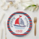 Tema náutico del niño de primer cumpleaños: placas de papel personalizadas con velero, con marco blanco y fondo de rayas rojas y de la marina. Personalice el texto usted mismo cuando lo solicite. Platos de papel divertidos para el cumpleaños temático náutico.