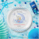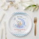 Un moderno diseño de ducha de bebé con un ilustracion acuarela de un niño elefante sentado en la luna con faro, velero, nubes y arranques. Este bonito diseño será un divertido añadido a tu ducha de bebé con temática náutica.