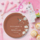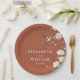 Estos modernos platos de terracota chinoiserie floral de papel para bodas en el jardín pueden ser personalizados con su información en una tipografía elegante. Diseñado por Thisisnotme©