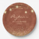 Platos rústicos y elegantes de terracota con papel de ducha con purpurina dorado y luces de cuerda. Personalizado con el nombre de la novia y su fecha de ducha.