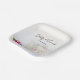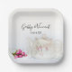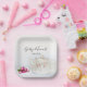 Personalice la tetera de bonito con placas de papel Boda de rosas rosas rosas con los nombres de la novia y el novio y la fecha de uso en su fiesta de té o jardín de alta intensidad ducha de novia o recepción matrimonial. Estos elegantes platos de personalizado desechable cuentan con una fotografía floral de una maceta de té florida con flores rosadas de rosa y satén blanco.