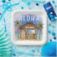 Las placas de papel higiénico tema de Tiki incluyen un bar tiki acuarela en la playa a la luz de la luna con palmeras, luces de cuerdas, antorchas tiki y un saludo hawaiano "Aloha". Cócteles tropicales, piña, hibiscos y hojas de palma, tablas de surf y un loro en un gorra pirata decoran el bar. Arte por KL Stock