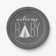 Las placas de papel de la fiesta de bienvenida al bebé que ofrecían un ilustracion de una tienda de los indios norteamericanos blanca del galón incorporaron en la frase "bebé de la recepción." el fondo es pizarra inspirada.