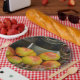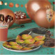 Estas placas de papel presentan una abundante cosecha veraniega de tomates de flores rojas y amarillas a rayas. ¡Genial para las reuniones de campo!