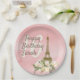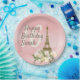 Platos de papel de 16 años de color personalizado rosa y dorado Sweet con la Torre Eiffel sobre un fondo rosa con elegantes flores blancas.