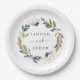 Estos platos de papel para tarta de boda de vegetación de otoño son perfectos para una boda de otoño. El diseño rústico moderno presenta hojas de color azul marino, verde salvia y dorado con ramitas de flores azul oscuro. Estos platos de papel desechables son perfectos para la mesa de pastel o postre. Personalízalos con los nombres de los novios.