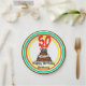 Feliz 50 cumpleaños - suministros de fiesta personalizados, decoraciones de fiestas, artículos de papel de cumpleaños. Una deliciosa torta de chocolate de tres niveles en llamas con velas de 50 cumpleaños. Personaliza el mensaje de cumpleaños y el nombre de la persona de cumpleaños. Combinación de color retro de color turquesa, naranja, amarillo y marrón para ese ambiente de los años 70.