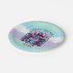 Gráficos de un quequito de vainilla con helado morado y azul con flores y un arco. Platos de cumpleaños personalizados morados, verde azulados, azules y rosas para una fiesta de cumpleaños.