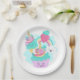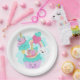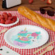 Un plato de papel con un bonito ilustracion con un quequito y helado sonriendo de alegría. Un arco iris y corazones rodean el dibujo. Una linda nube esponjosa también sonríe con felicidad. El quequito y el helado tienen un cuerno de unicornio de moda encima. Diseño bonito y adorable lleno de alegría.