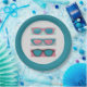 Impresión artística ilustrada a mano divertida con un trío de gafas de sol en tonos rosas, azules y grises sentados en un entorno angustiado. Rodeado por un patrón de manchas azules coordinadas. Ideal para un fiesta de piscina, una barbacoa o simplemente un verano divertido para reunirse.
