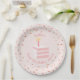 Un lindo plato de papel para una fiesta de primer cumpleaños con una rebanada de pastel rosa y un diseño de una sola vela. Personalice fácilmente este diseño con los detalles de su fiesta. Consulte nuestra colección de coincidencias para coordinar elementos.