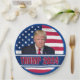 El Fiesta de Trump 2024 coloca a Donald Trump con la bandera estadounidense detrás de él, Trump 2024 delineado en blanco en el fondo. Placa de borde azul.
