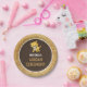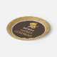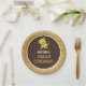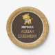 Elegantes platos de papel con un adorable cachorro con una vibrante tipografía sobre un fondo marrón oscuro y purpurina de color dorado.