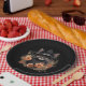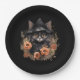 Platos de papel con un ilustracion lindo. Un gato negro de cabello largo vestido con el gorra de una bruja negra. Son las orejas que salen. Rodeado de flores de otoño naranjas y marrones. Diseño impresionante para objetos con temática de bruja y Halloween.