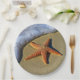 Sorprendente fotografía de playa, una estrella de mar naranja brillante en el borde del agua a punto de ser cubierta por una suave ola.