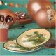 Placas de papel con una escena vintage de una imagen Navidad de 1909 con flores naranjas y rama de pino.