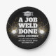 Añada un toque elegante y personalizado a la decoración de la fiesta de graduación de soldadura con placas de papel redondo personalizado "A Job Weld Done". Toda la redacción de esta plantilla es sencilla de personalizar o de eliminación, incluida la cita graciosa. El diseño en blanco y negro incluye una antorcha de soldadura con chispas, una falsa placa de mortero de acero inoxidable y moderno nombre de graduado en tipografía audaz, año de clase y escuela. Tenga en cuenta que la tapa de graduación de plata es de color impreso, no de Relieve metalizado metálico. El elegante diseño hace una adición divertida y única a la celebración de la graduación de un soldador. ¡Felicitaciones al graduado!