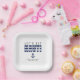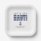 Platos de papel con rayas azules y blancas para una fiesta de soltero/soltera. Personalízalo con tu propio texto.