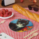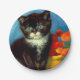 Placas de papel con un hermoso gato Van Gogh tuxedo! Este pequeño gatito se encuentra junto a una cesta de flores naranjas sobre una mesa roja. ¡Un gran regalo para los amantes del gato y para los coleccionistas holandeses de arte!