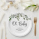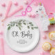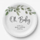 Estos adorables platos de papel para bebé neutros en género minimalista presentan hojas botánicas de color agua simples en un fondo blanco y limpio. La tipografía de escritura negra de moda dice "oh baby" y agrega un toque extra de estilo moderno.