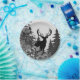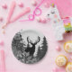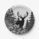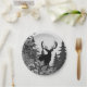 El ciervo emerge de los pinos y está rodeado de flores silvestres en un simple diseño de vida silvestre.
