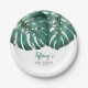 Elegante plato tropical de papel de bebé con ilustracion de hojas verdes de monstera. Este diseño botánico neutro de género es ideal para una ducha de verano.
