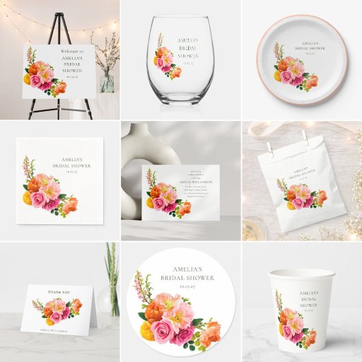 Platos de Papel para Bridal Shower de Amapolas Florales Coloridas Vibrantes en Amarillo, Naranja y Rosa