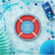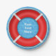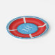 Diseño de salvavidas rojas sobre fondo de ondulación azul curley para personalizar por diversión productos personalizados de fiesta con temática náutica.