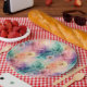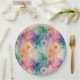 Vintage dandelion abstract pattern paper plate featuring delicate seed heads layered over rich teal, pink, and muted purple watercolor textures. Dreamy and artistic with an ethereal mixed-media aesthetic, this seamless design is ideal for botanical art lovers, boho style fans, nature enthusiasts, and vintage-inspired decor admirers.