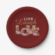 Las palabras inspiradoras "vivas, risa, amor" con amor deletrearon hacia fuera en un estampado de plores rústico.