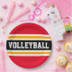 This sporty design features bold VOLLEYBALL text inside a wide black horizontal center racing stripe highlighted with floating white and golden yellow orange stripes against bright red outer stripes. The text can be personalized.