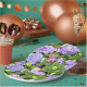 Disfrute de una abundancia de hermosas hortensias azules rosas y lavanda todo el año con estas placas de papel de alta calidad con una pintura digital de acuarela original de la artista digital Leslie Sigal Javorek, con elementos inspirados en el batik. Combine con la coordinación de los suministros de fiesta de HoMeArts para esa ducha especial de novias, reunión de Pascua o Fiesta de té en el jardín.